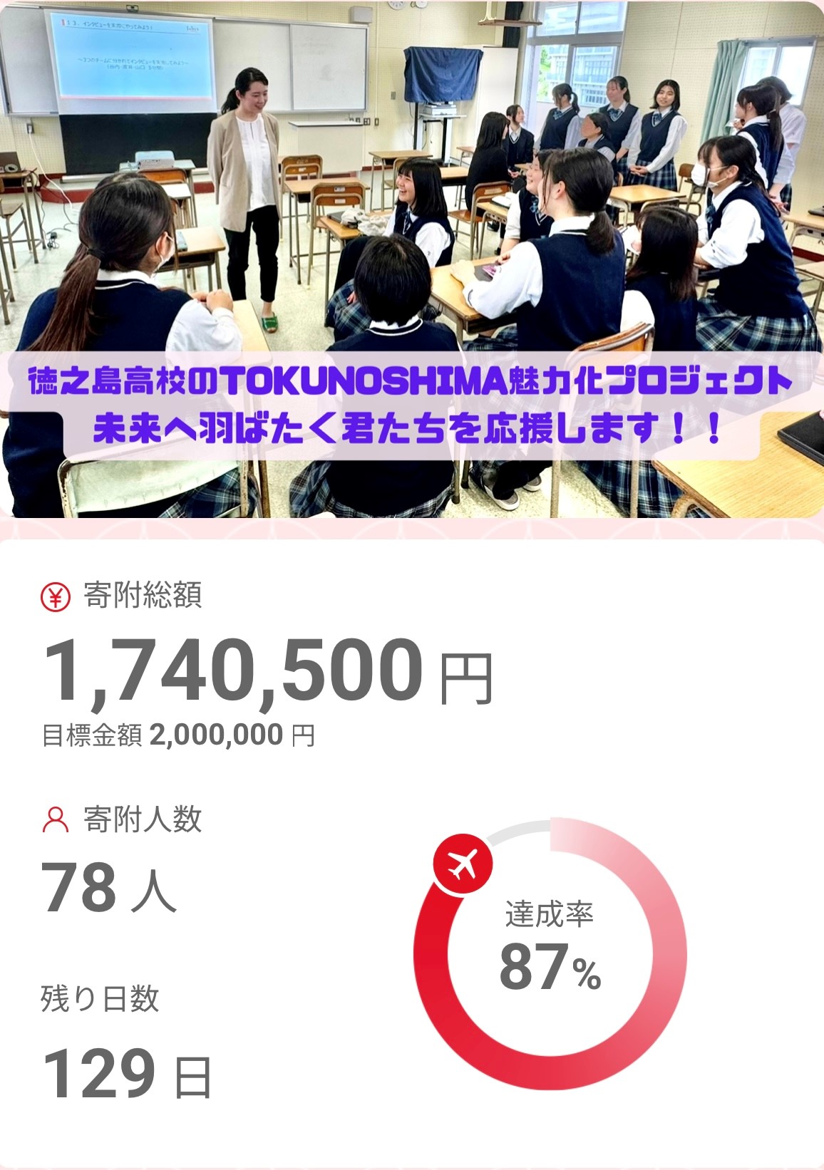 æ¥é ãã埳ä¹å³¶é«æ ¡ãžã®å¿æŽãããžã§ã¯ããæ¯ããŠäžããæ¬åœã«ããããšãããããŸãïŒïŒ